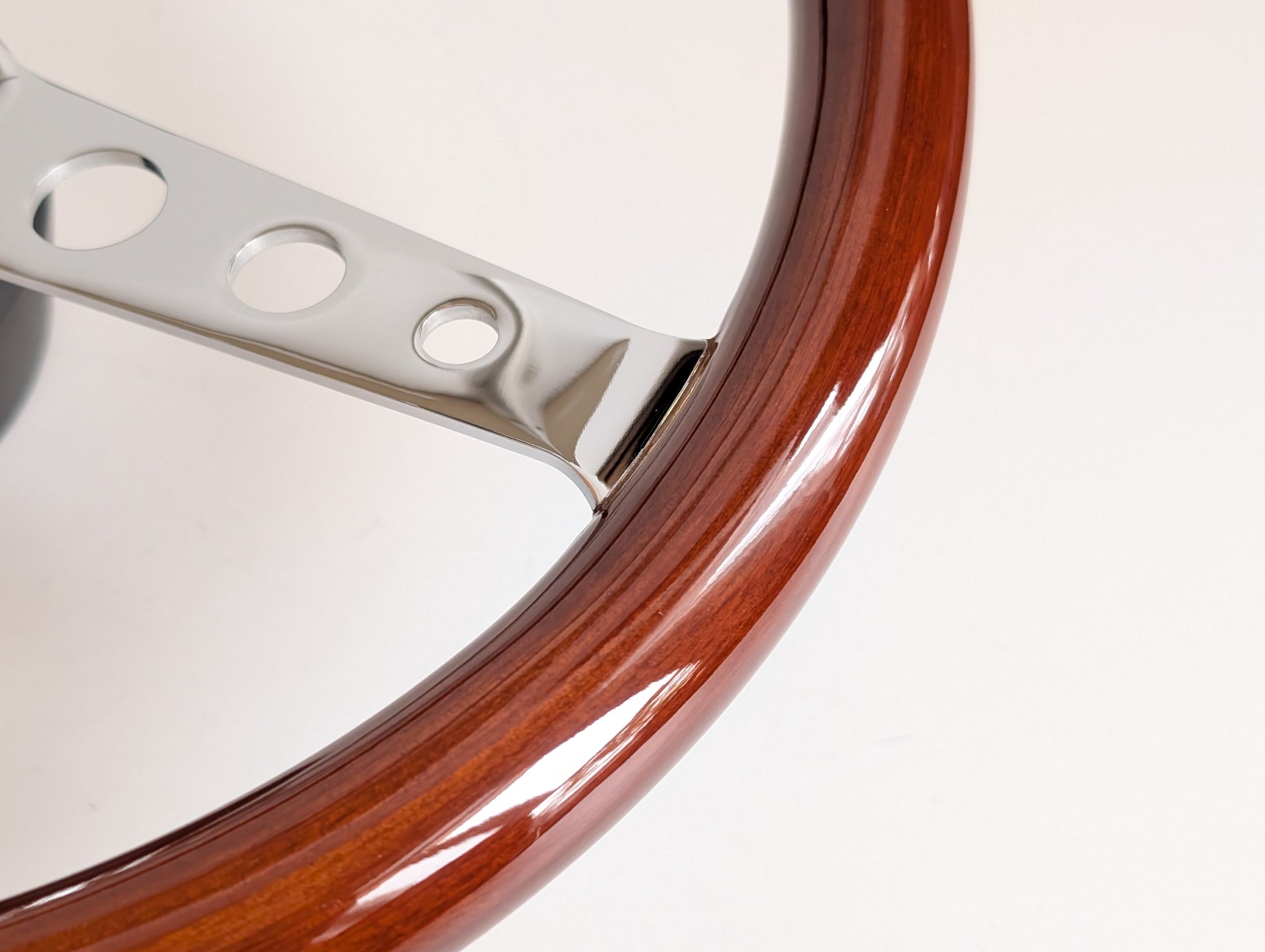 Steering Wheel For Ford Bronco Thunderbird Mustang F150 F250 F350 - Wooden Rim, Chrome Spokes with Holes, Classic, Vintage Style, 380 mm