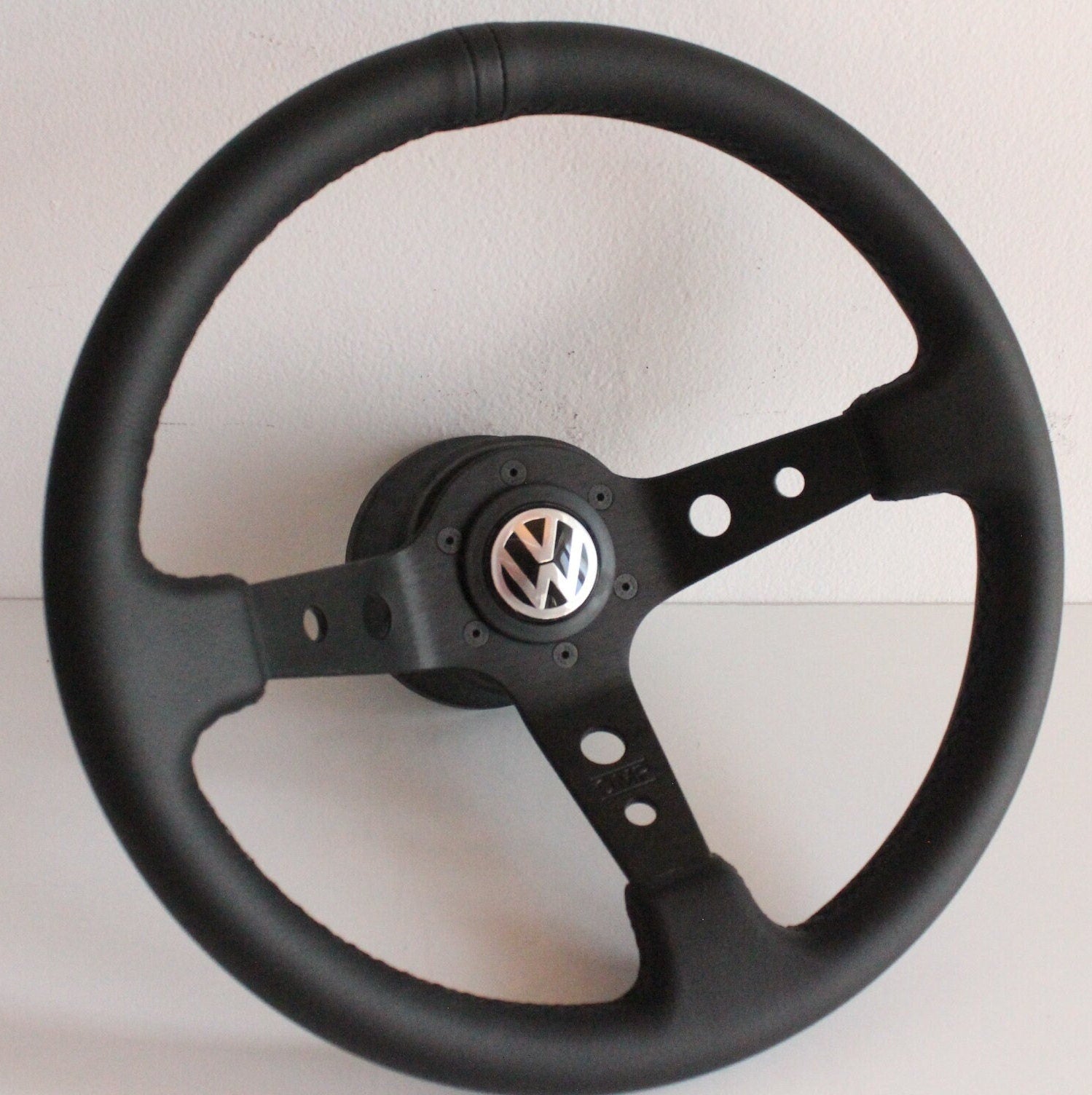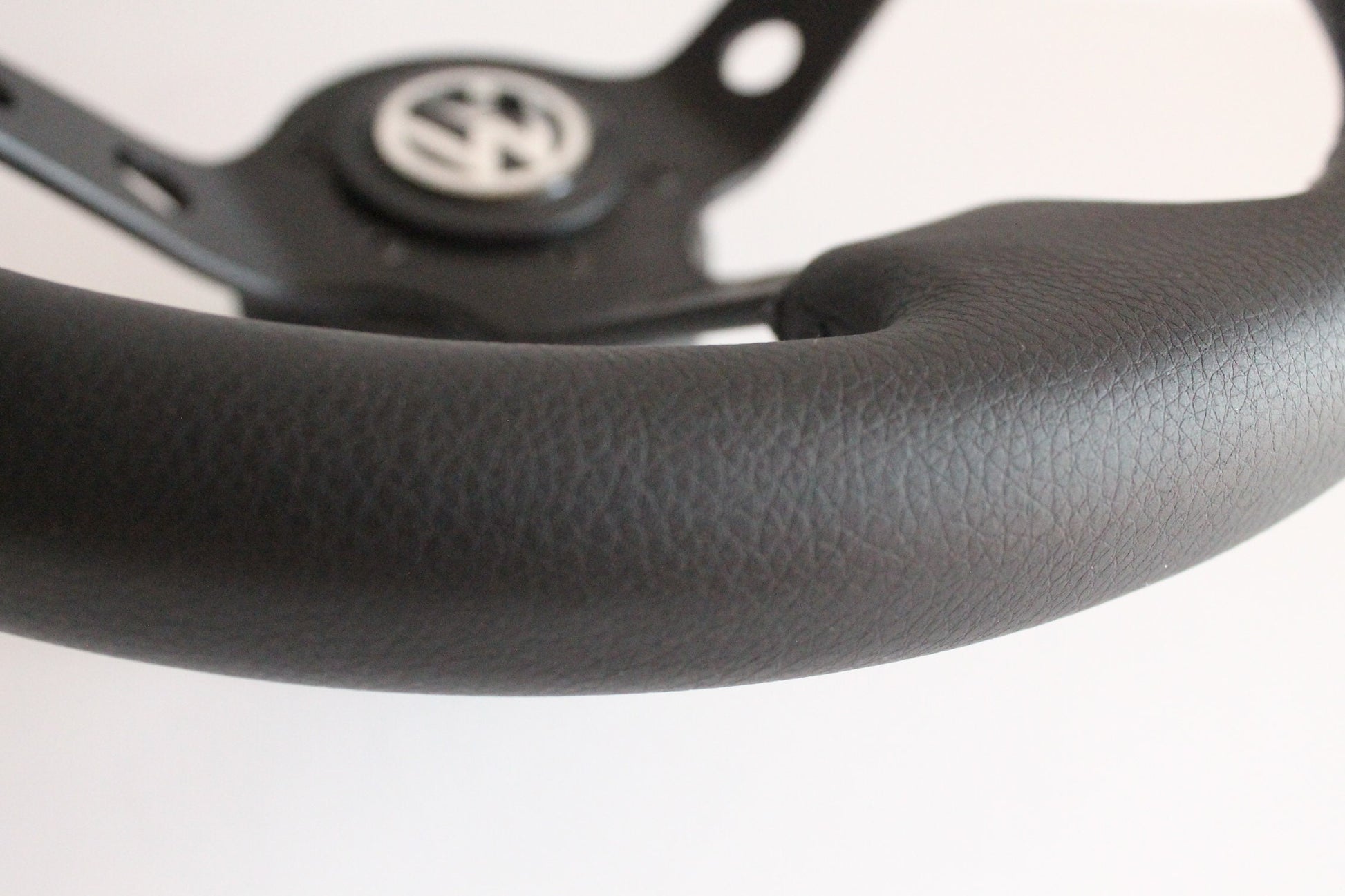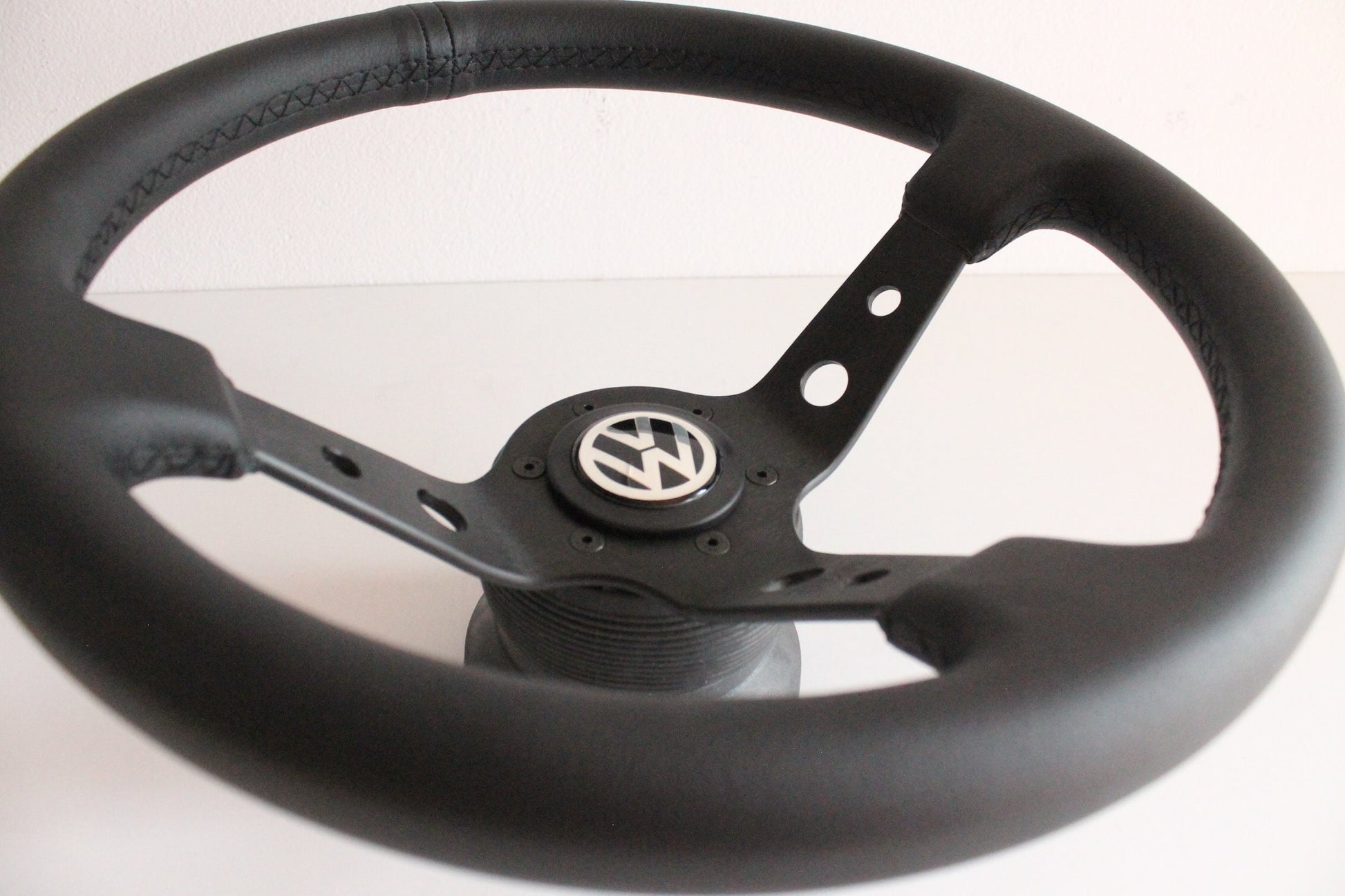 Steering Wheel For VW - Mk1 Mk2 Golf Jetta Scirocco Passat - Deep Dish, Black Leather, Black Stitching, Sport Vision, 350 mm