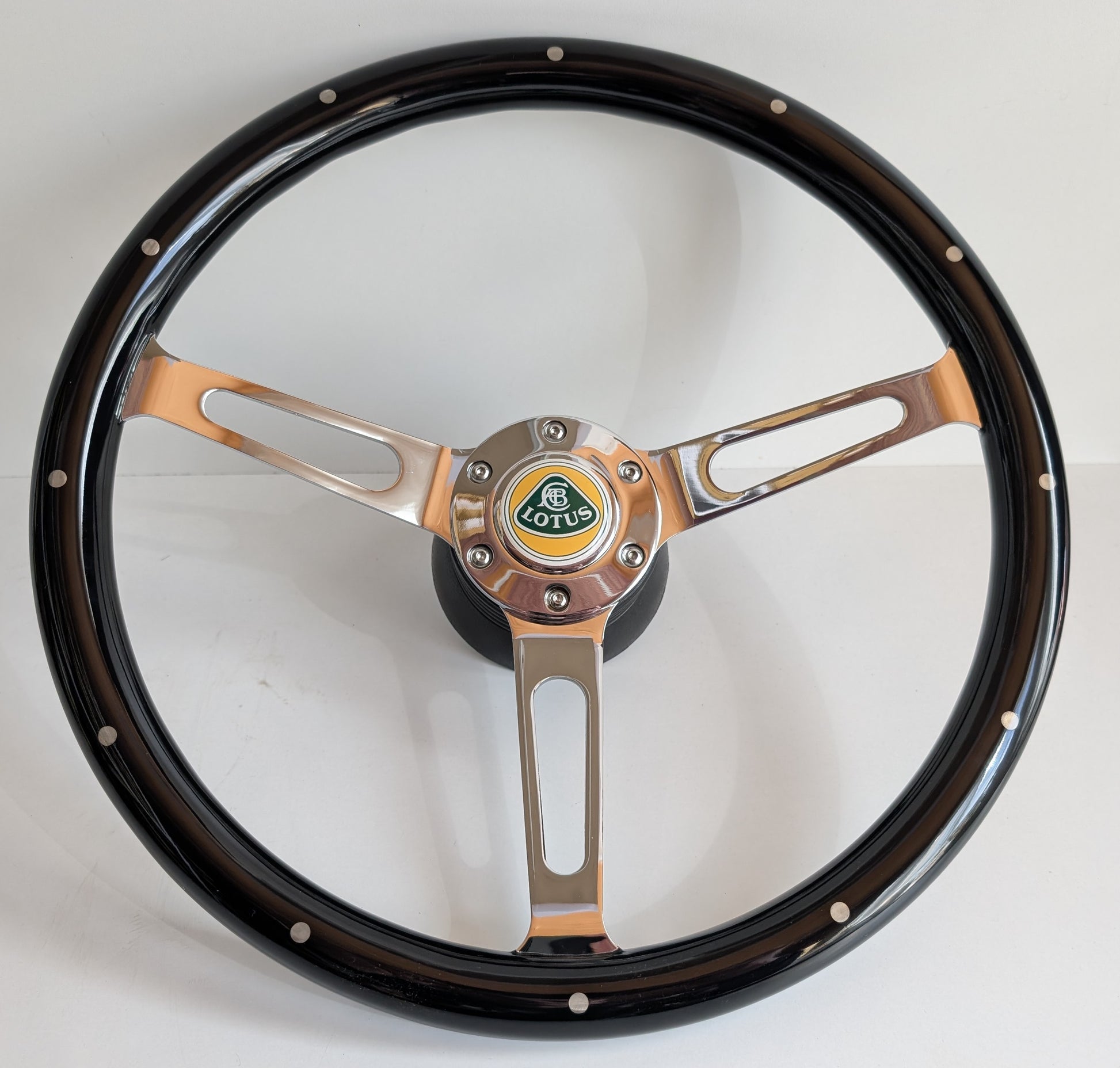 Steering Wheel For Lotus Europa & Super 7 (1966–1975) - 380mm Wooden Rim, Black Finish & Chrome Spokes